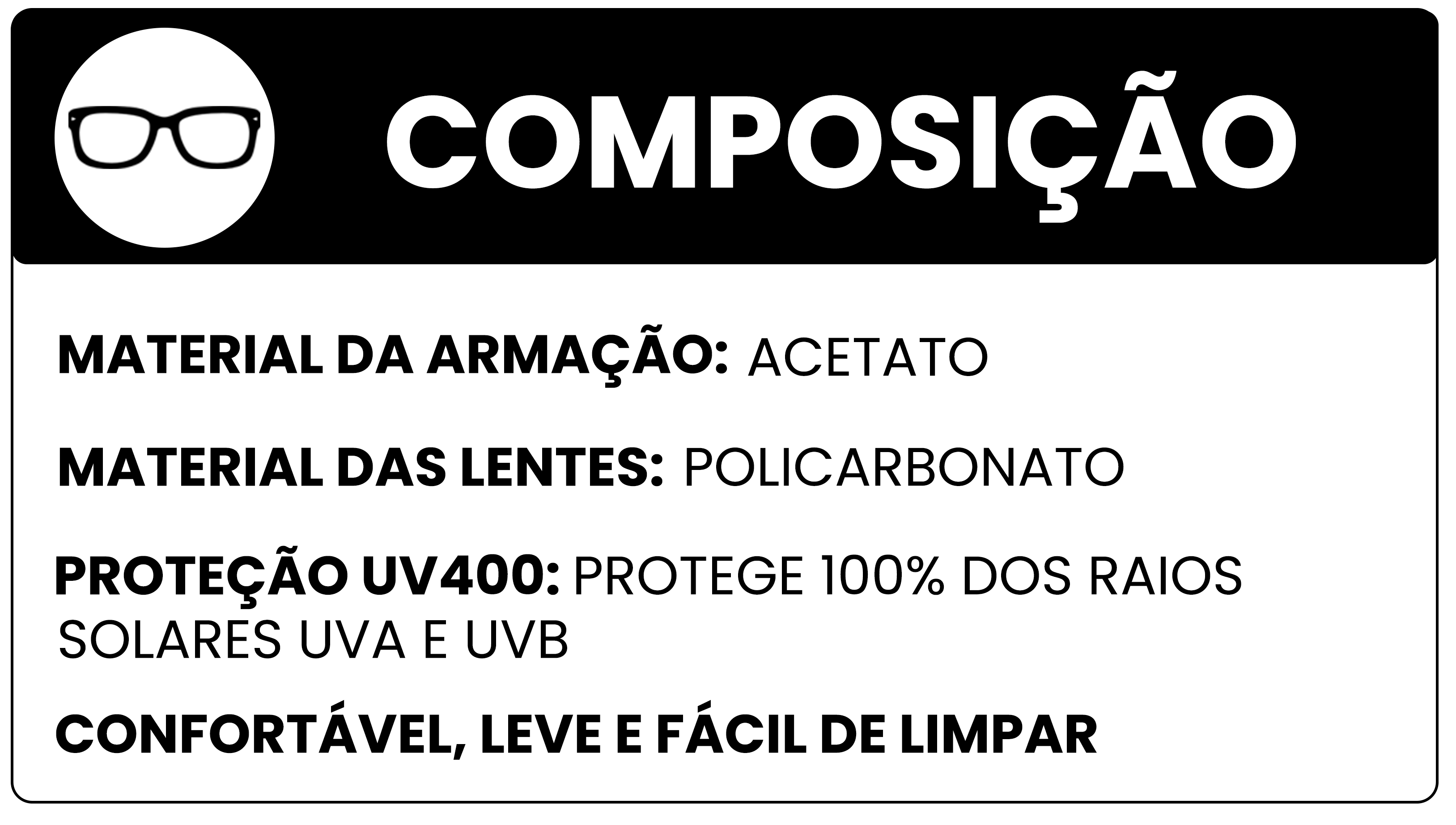 A armação leve garante ajuste confortável no rosto, enquanto as lentes polarizadas com proteção UV400 bloqueiam os raios nocivos e reduzem o reflexo da luz — pra você enxergar com nitidez e zero incômodo!
